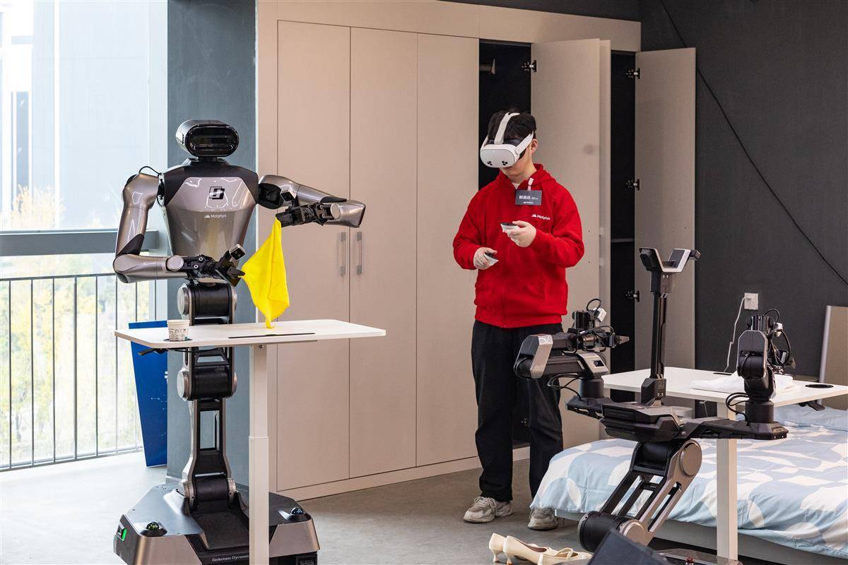 現地で行われたデモンストレーションでは、記者がVRゴーグルを装着して仮想世界に入り、ロボットの学習過程を観察した。仮想のスーパーで記者が棚から飲料を取ると、現実世界のロボットも即座に同じ飲料を取り出した。また、仮想の寝室で記者が布団をたたむと、ロボットも瞬時に同じ動作を再現した。