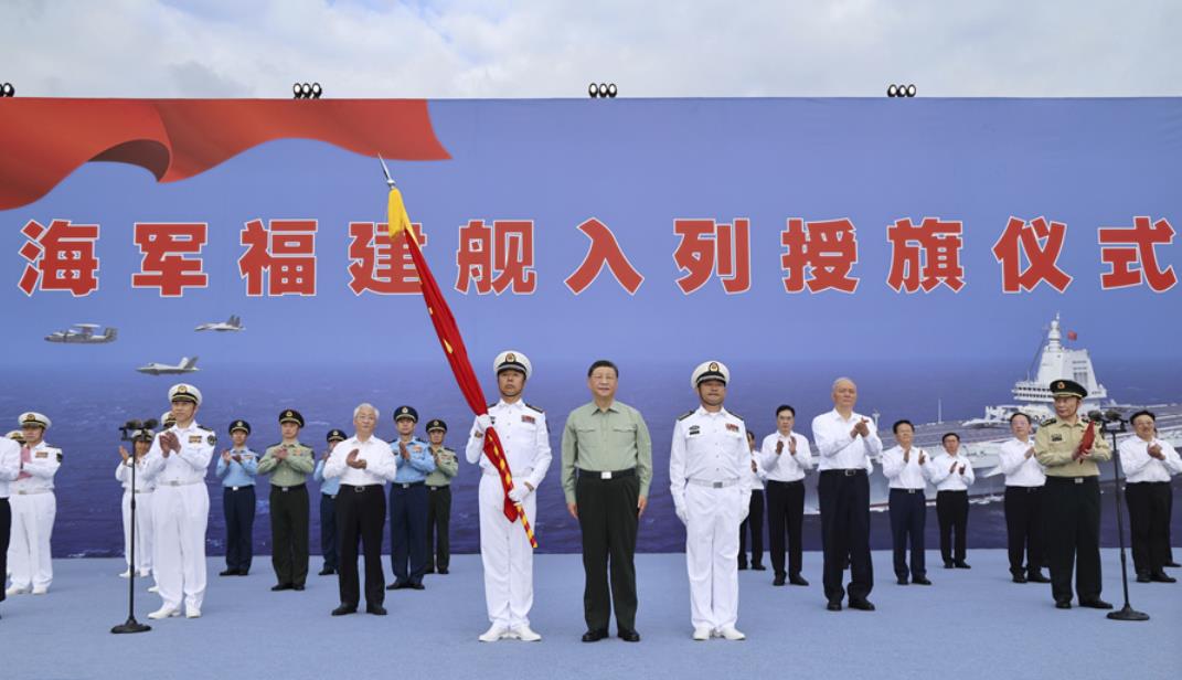 新華社の報道によると、中国初の電磁カタパルト(電磁式射出装置)を搭載した航空母艦「福建艦」の就役・軍旗授与式が、11月5日、海南省三亜の軍港で行われた。式典には中国共産党中央総書記であり、国家主席・中央軍事委員会主席の習近平氏が出席し、授旗後に艦上を視察した。