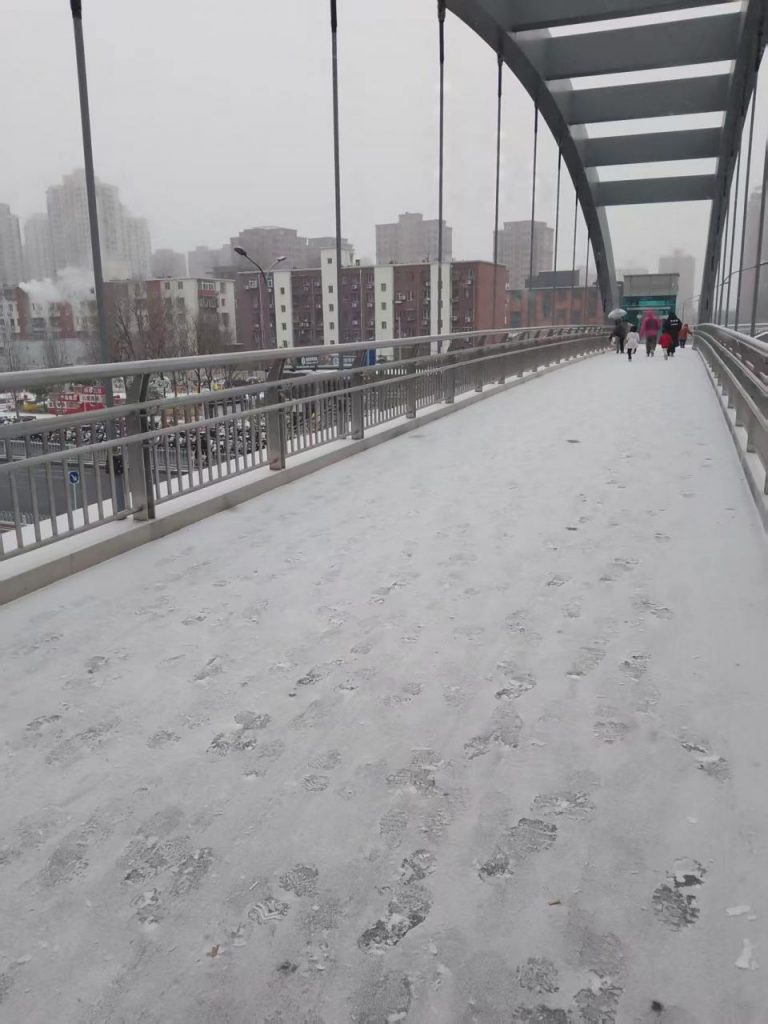 中国では雪は吉祥の兆しであり、報道も雪による交通障害や転倒者の発生などより「喜ばしいもの」として伝えることが多い。なおこの日は雪について“蓝色预警”が発令されていた。おおよその目安であるが、“蓝色预警”=「情報」、“黄色预警”=「注意報」、“橙色预警”=「警報」“红色预警”=「特別警報」、といった感じである。(森 雅継)