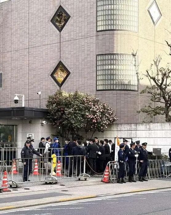 中国大使館から通報を受けた後、多くの日本の警察官が大使館前に駆け付けた。