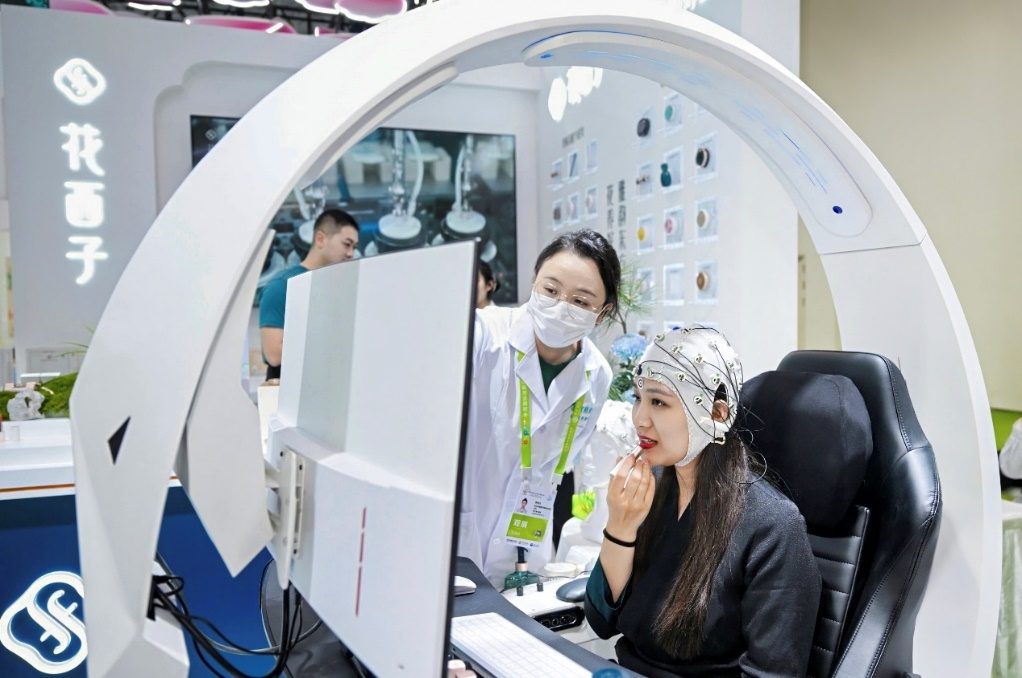 会場では、体験者が電極キャップを装着して専用装置に座ると、短時間で個人の嗜好がAIによって分析される。Florasis(花西子)が上海交通大学と共同開発したこのシステムは、脳波や視線の動き、微表情、身体の動作などをリアルタイムで計測し、製品に対する感覚的な評価を定性的・定量的に分析する。従来の主観的なアンケート中心の手法と比べ、より精度の高いデータ取得が可能で、「化粧品評価の“うそ発見器”」ともいえる仕組みだ。